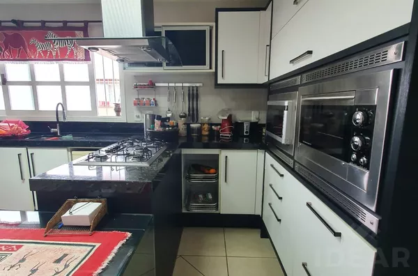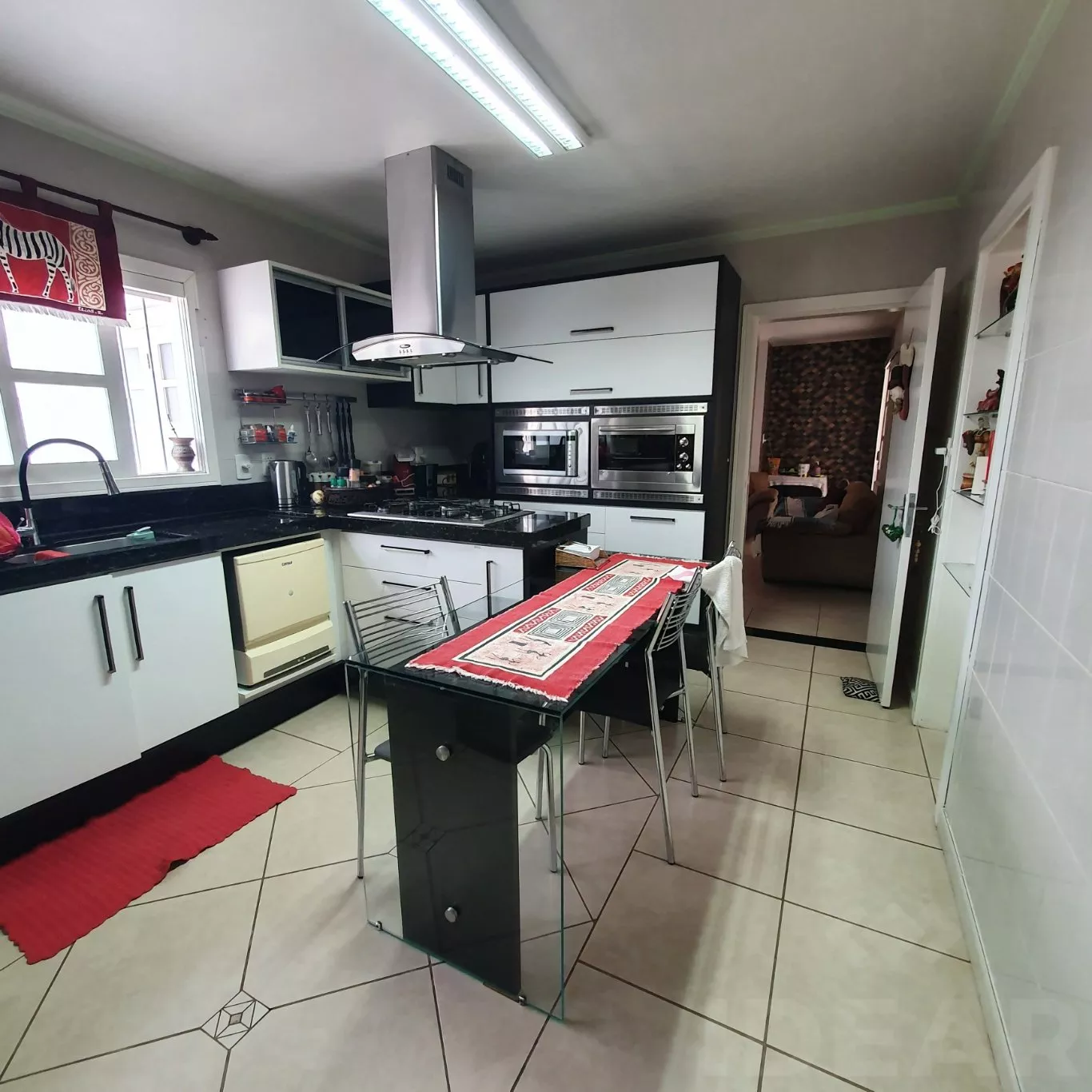 - NA COZINHA FICAM OS MÓVEIS PLANEJADOS, A COIFA E A MESA COM AS CADEIRAS